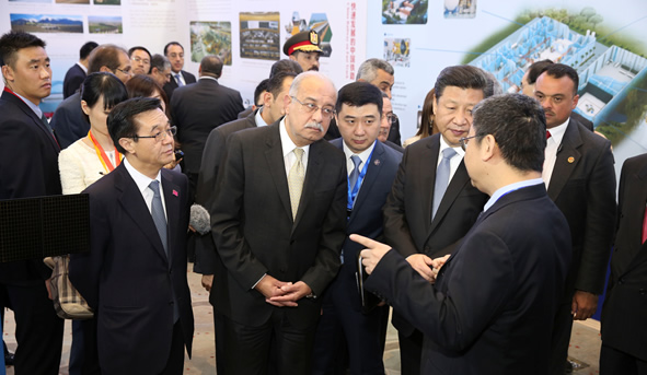 1月20日下午,国家主席习近平与埃及总理伊斯梅尔共同参观了本次展览,并亲临中国航天展台听取了介绍。长城公司总工程师虎刚向习近平主席和伊斯梅尔总理介绍了中埃航天合作情况。