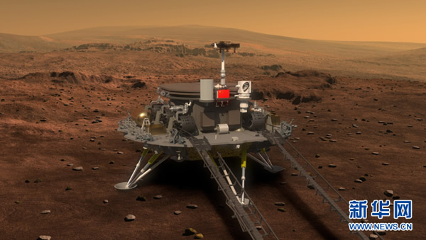 着陆巡视器与环绕器分离后进入火星大气,经过气动外形减速、降落伞减速和反推发动机动力减速,最后下降着陆在火星表面,火星车驶离着陆平台,开始火星表面巡视探测,要探测火星的形貌、土壤、环境、大气,研究火星上的水冰分布、物理场和内部结构。