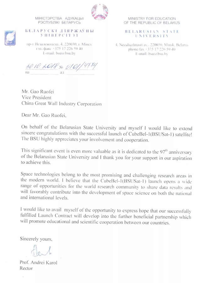 白俄罗斯国立大学校长安德烈·卡罗尔专门致函,对长城公司为白俄罗斯科教卫星的圆满发射以及对项目所做贡献表示衷心感谢。