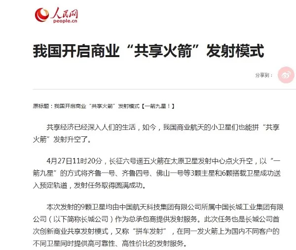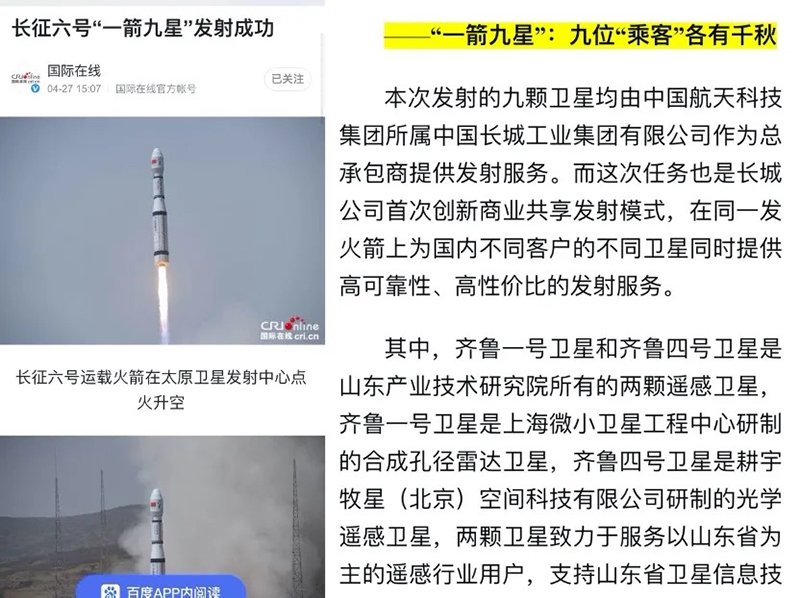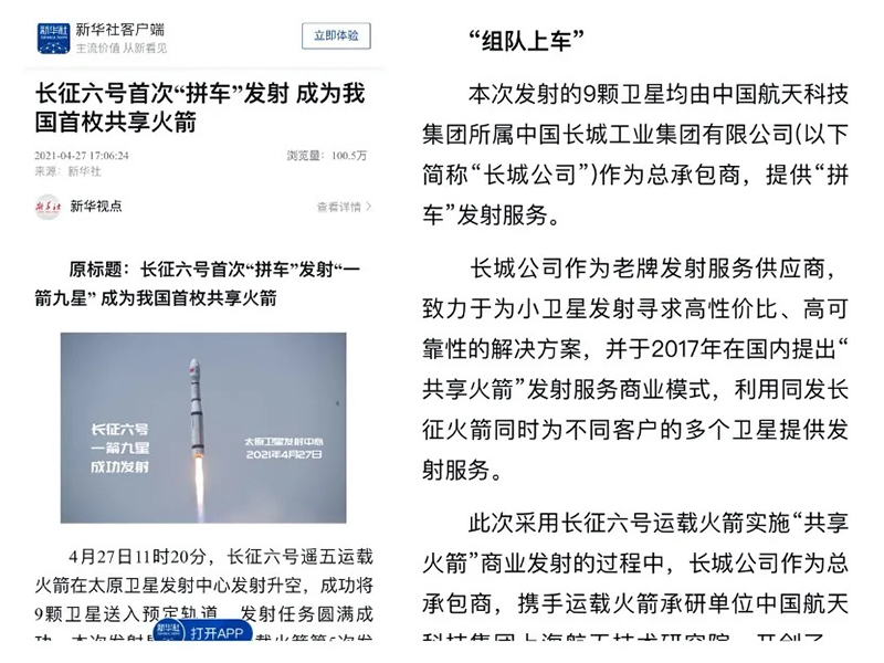 4月27日11时20分,长城公司首创并主导的“共享火箭”模式打响头炮。“一箭九星”发射任务取得圆满成功。长城公司2019年在国内首次创造性地提出“共享火箭”发射服务商业模式,在首次采用长征六号运载火箭实施“共享火箭”商业发射的过程中,长城公司作为总承包商,携手运载火箭承研单位上海航天技术研究院,开创了一整套从技术协调到商务规划的“共享火箭”管理流程,为后续开展类似商业发射服务打下坚实基础。