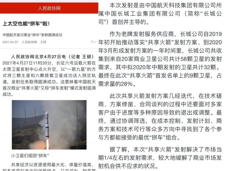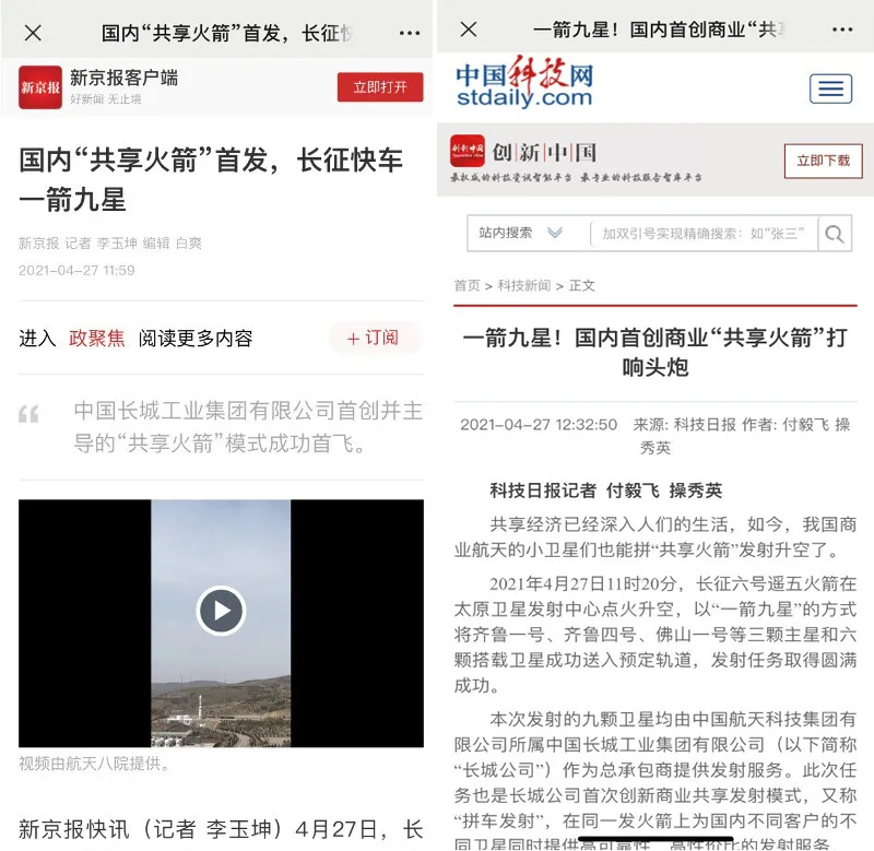 人民网、人民政协网、国际在线、ChinaDaily、新京报、SpaceNews等媒体在报道中介绍了长城公司作为总承包商提供发射服务的情况,指出此次任务也是长城公司首次创新商业共享发射模式,又称“拼车发射”,在同一发火箭上为国内不同客户的不同卫星同时提供高可靠性、高性价比的发射服务。