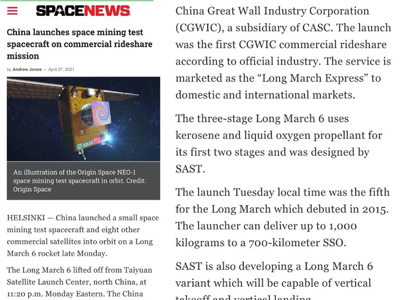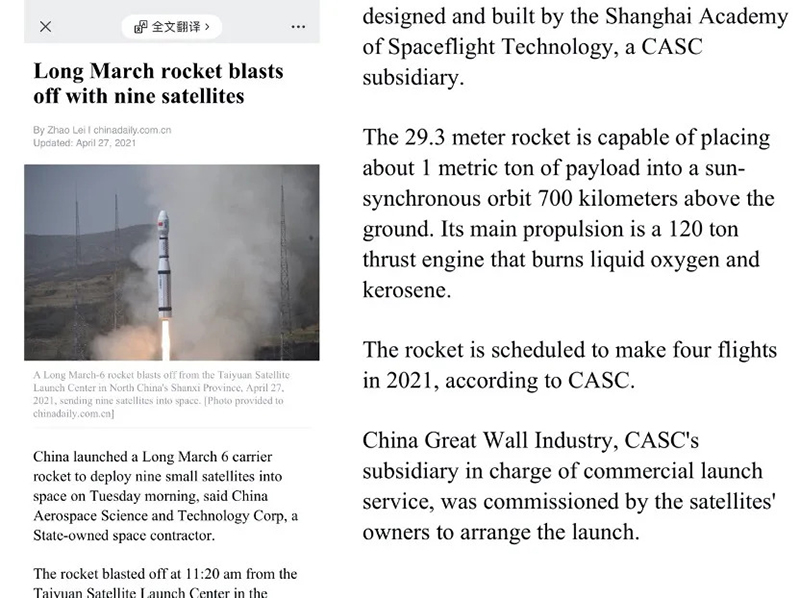 4月27日,新华社刊文报道,本次发射的九颗卫星均由中国航天科技集团所属中国长城工业集团有限公司作为总承包商提供发射服务。而这次任务也是长城公司首次创新商业共享发射模式,在同一发火箭上为国内不同客户的不同卫星同时提供高可靠性、高性价比的发射服务。