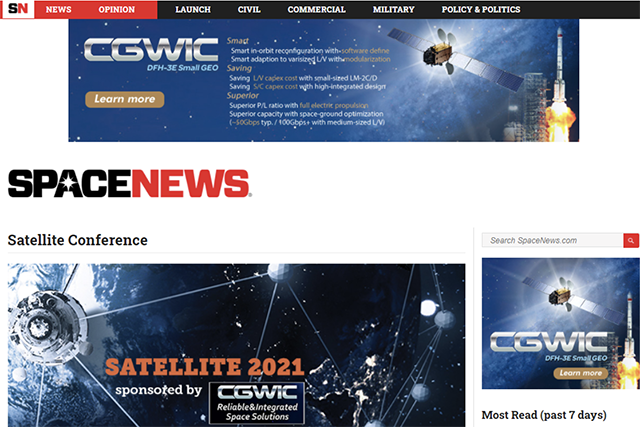 近日,国际知名媒体SpaceNews网站首页出现了公司最新投放的广告。广告共有5种不同尺寸,以DFH-3E通信卫星平台及优势、长征运载火箭元素和公司标志等全方位展示中国航天多样化和具有竞争力的宇航产品。点击广告可跳转至公司英文网站,让国际范围内关注和订阅SpaceNews新闻的用户了解公司更多信息。
