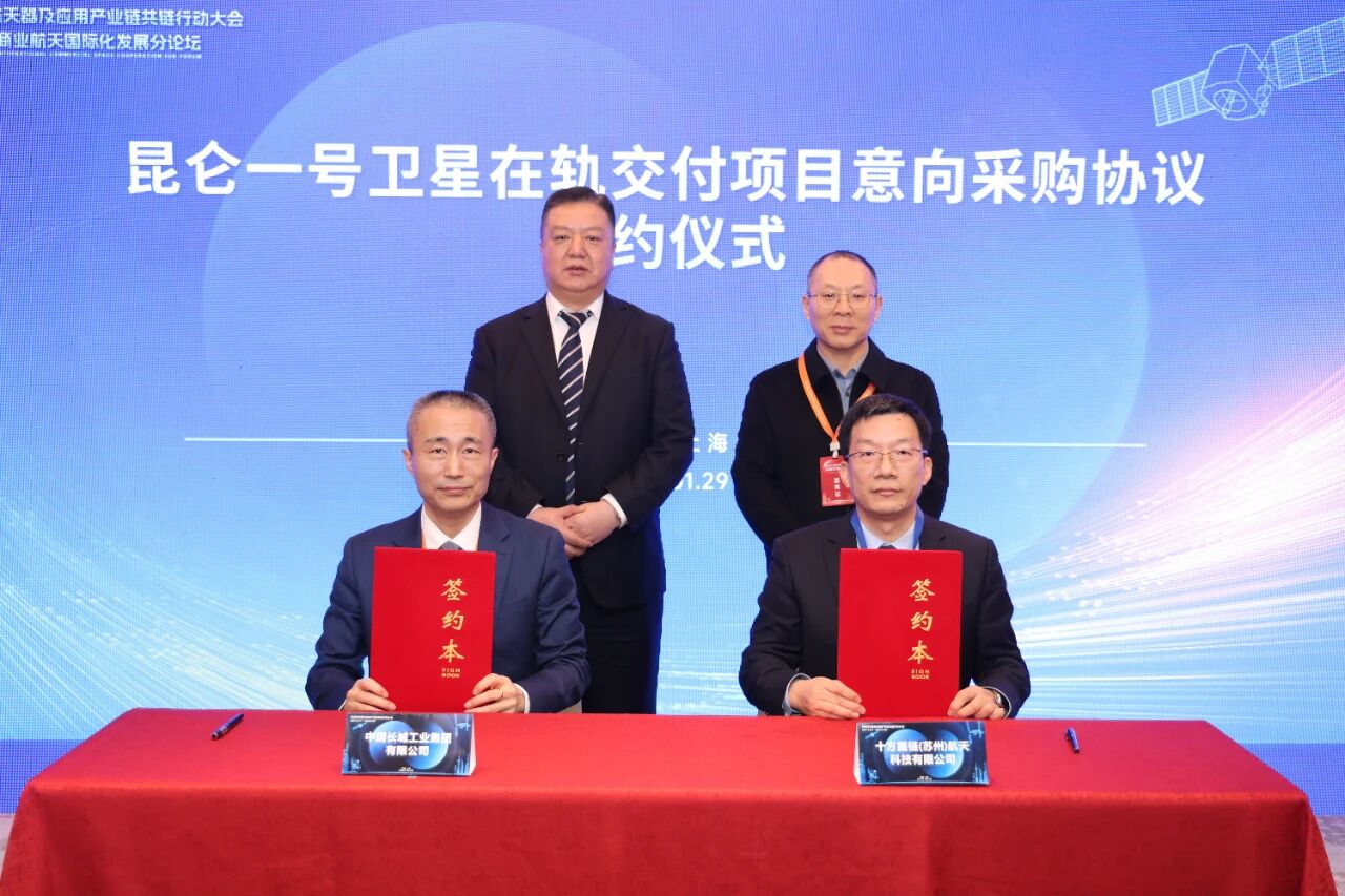 在全场嘉宾的见证下,会上举行了昆仑一号卫星在轨交付项目意向采购协议签约仪式,这是长城公司新时期构建商业卫星在轨交付业务国内国际双循环格局的重要里程碑。
