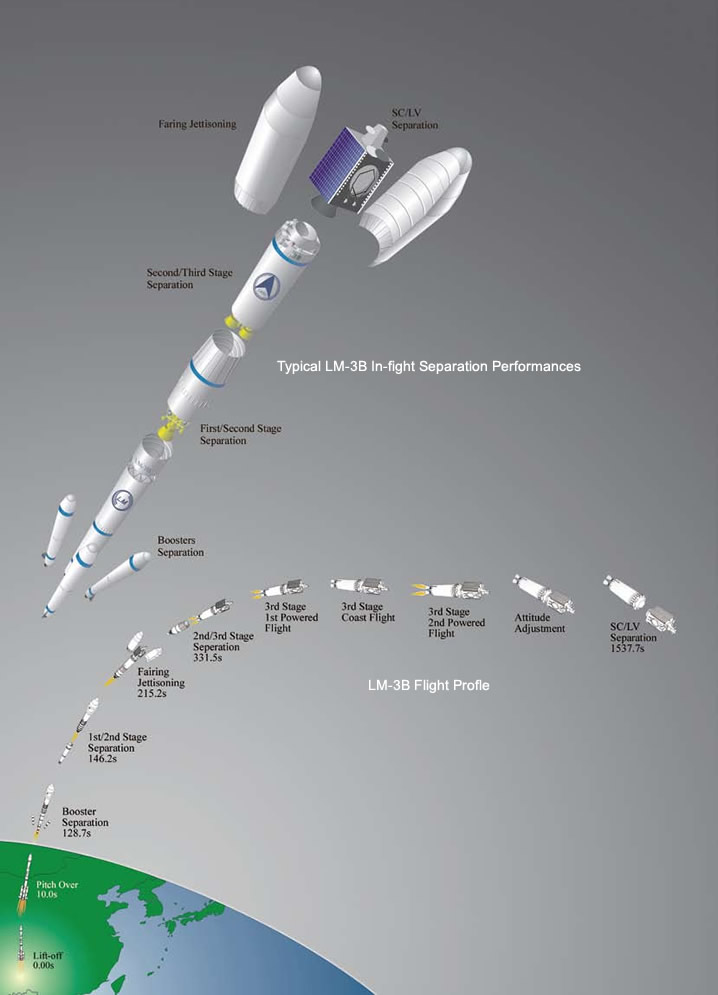 LM-3B运载火箭是长征运载火箭系列中推力最大的火箭之一。它是以长征三号甲运载火箭 (LM-3A) 为芯级,并在第一级捆绑四个液体助推器形成的。LM-3B运载火箭的研制广泛地继承了长征系列运载火箭经飞行验证的成熟技术,地球同步转移轨道 (GTO) 的运载能力为5,100公斤。